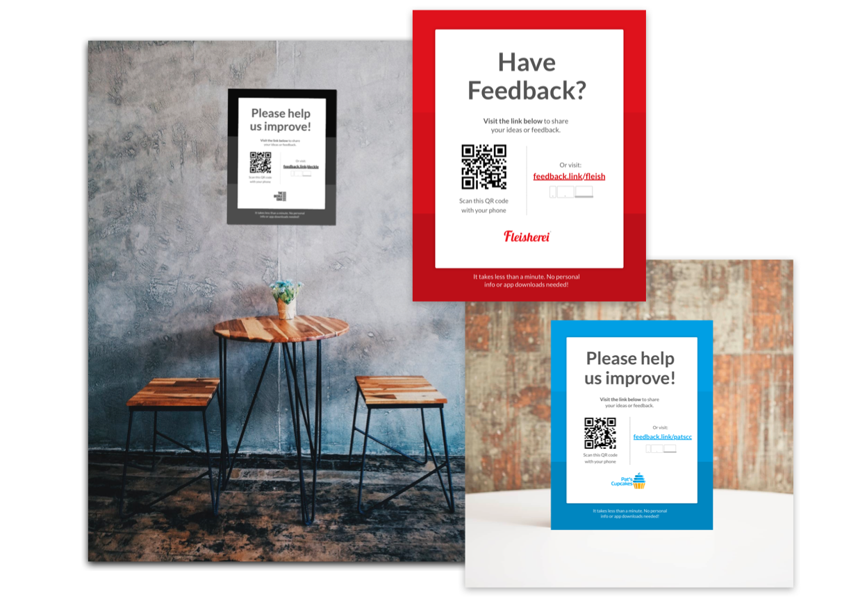 Display your feedback link and QR code on Posters, Table Top Stands etc.